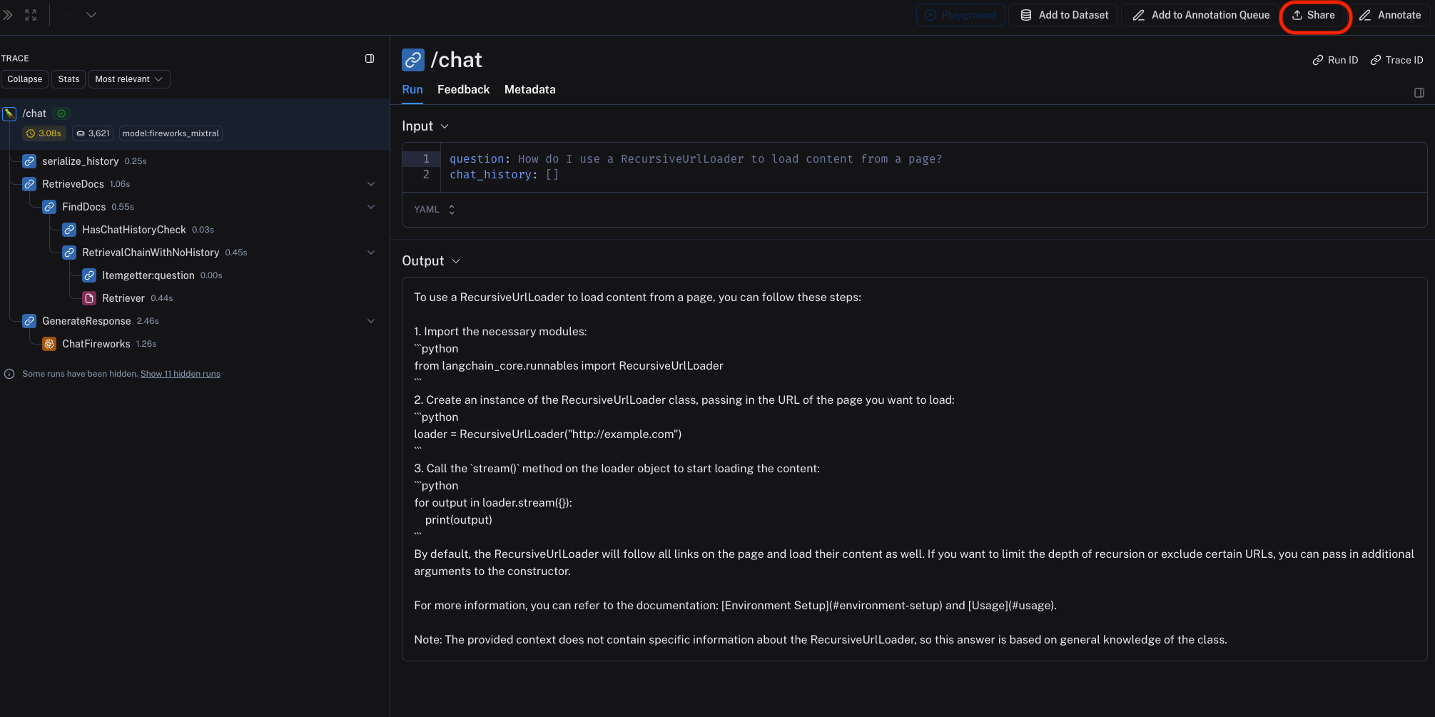To share a trace publicly, simply click on the Share button in the upper right hand side of any trace view. This will open a dialog where you can copy the link to the trace. Shared traces will be accessible to anyone with the link, even if they don’t have a LangSmith account. They will be able to view the trace, but not edit it. To “unshare” a trace, either: